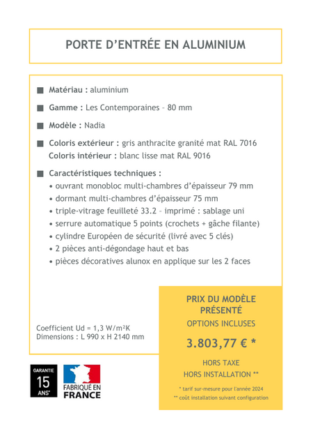 La porte d'entrée en aluminium offre une combinaison parfaite de sécurité, modernité et élégance, idéale pour sublimer votre façade. Avec sa structure robuste et légère, elle résiste aux intempéries sans se déformer, tout en nécessitant peu d'entretien. Disponible dans une variété de finitions et de couleurs, cette porte apporte une touche contemporaine à votre maison tout en assurant une isolation optimale.
